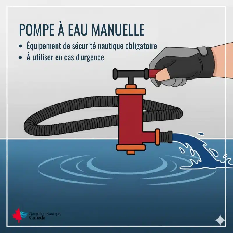 C’est pourquoi le Règlement sur les petits bâtiments du Canada exige que vous ayez toujours à portée de main une pompe à eau manuelle, une écope ou une pompe de cale électrique pour vous dépanner. Il s’agit d’un équipement de sécurité nautique obligatoire.